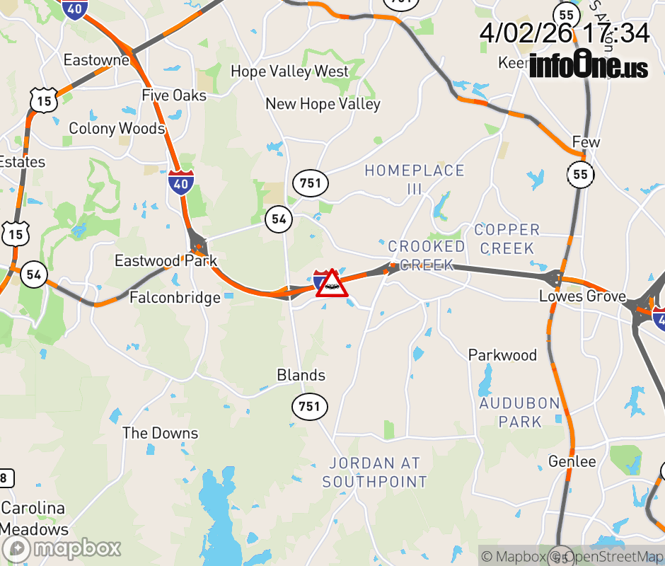 The left shoulder is closed after Exit 274 (NC 751). Updated: Thu 4/2/26 5:34 PM EDT ![]() Updated: Thu 4/2/26 5:34 PM EDT |