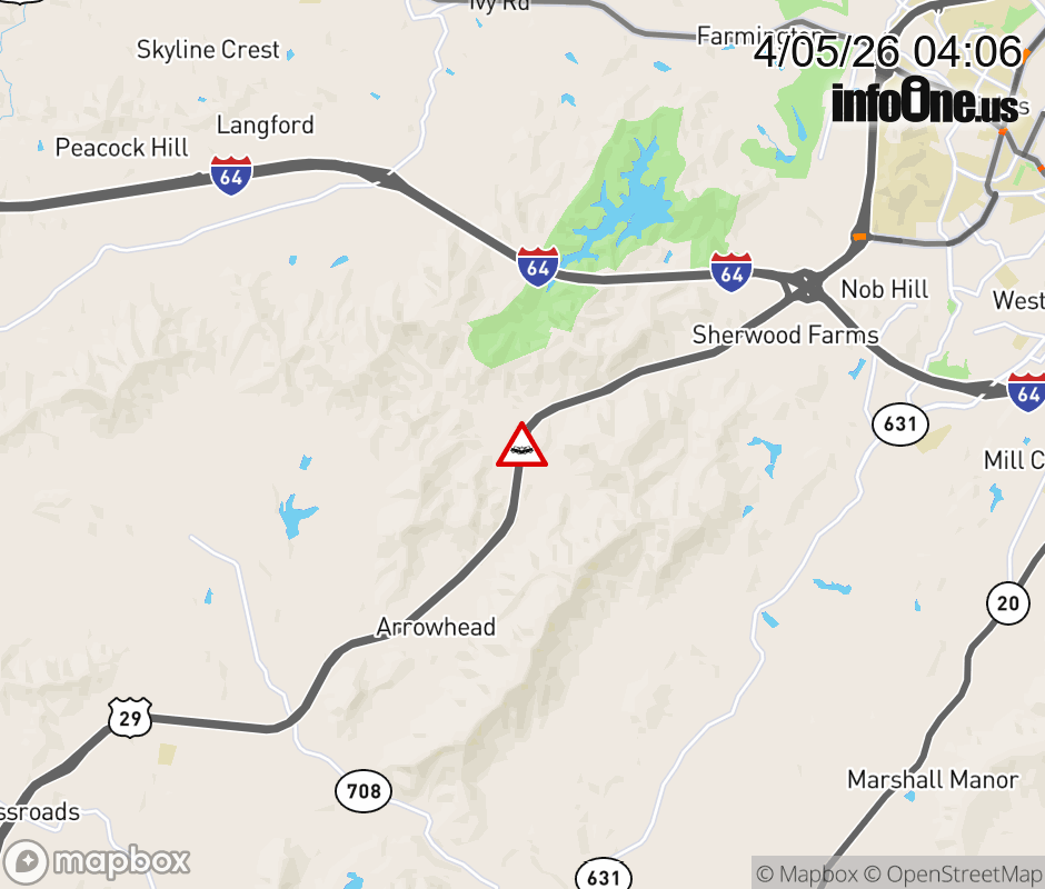 On US-29 in the County of Albemarle, in the vicinity of Arrowhead Valley Rd; Crossover; Rt. 745N/S (Albemarle County), motorists can expect delays due to a multi-vehicle crash. All south lanes are closed. Updated: Sun 4/5/26 4:06 AM EDT ![]() Updated: Sun 4/5/26 4:06 AM EDT |