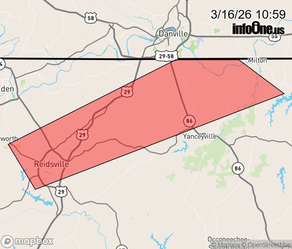 Canceled 3/16/26 11:20 AM Tornado Warning issued March 16 at 10:58AM EDT until March 16 at 11:30AM EDT by NWS Blacksburg VA TORRNK The National Weather Service in BLACKSBURG has issued a * Tornado Warning for... East central Rockingham County in north central North Carolina... Northern Caswell County in north central North Carolina... * Until 1130 AM EDT. * At 1058 AM EDT, a severe thunderstorm capable of producing a tornado was located over Reidsville, moving northeast at 55 mph. HAZARD...Tornado. SOURCE...Radar indicated rotation. IMPACT...Flying debris will be dangerous to those caught without shelter. Mobile homes will be damaged or destroyed. Damage to roofs, windows, and vehicles will occur. Tree damage is likely. * Locations impacted include... Reidsville... Wentworth... Yanceyville... Bethel... Providence... Gatewood... and Quick. ![]() |