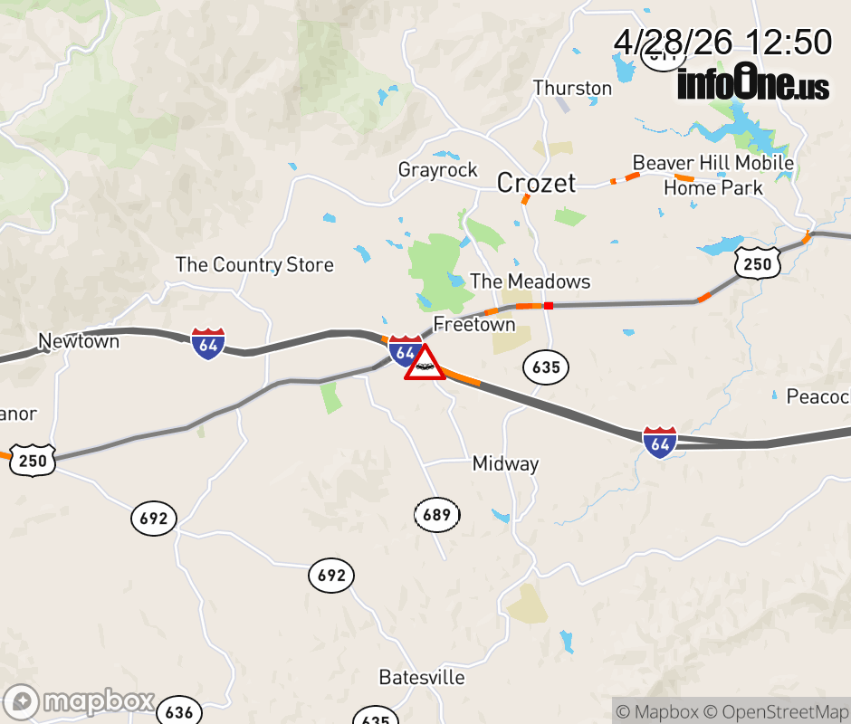 On I-64 at mile marker 107.6 in the County of Albemarle, motorists can expect delays due to a vehicle crash. The west left shoulder and left lane are closed. Updated: Tue 4/28/26 12:50 PM EDT ![]() Updated: Tue 4/28/26 12:50 PM EDT |