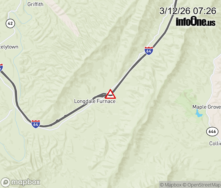 On I-64 at mile marker 36.2 in the County of Alleghany, motorists can expect delays due to a tractor trailer crash. The east left shoulder and left lane are closed. Updated: Thu 3/12/26 7:26 AM EDT ![]() Updated: Thu 3/12/26 7:26 AM EDT |