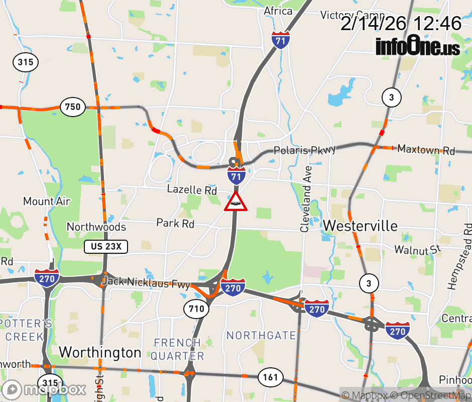 The right lane is blocked on I-71 North at Polaris Pkwy/Gemini Place, due to a crash. Updated: Sat 2/14/26 12:46 PM EST ![]() Updated: Sat 2/14/26 12:46 PM EST |