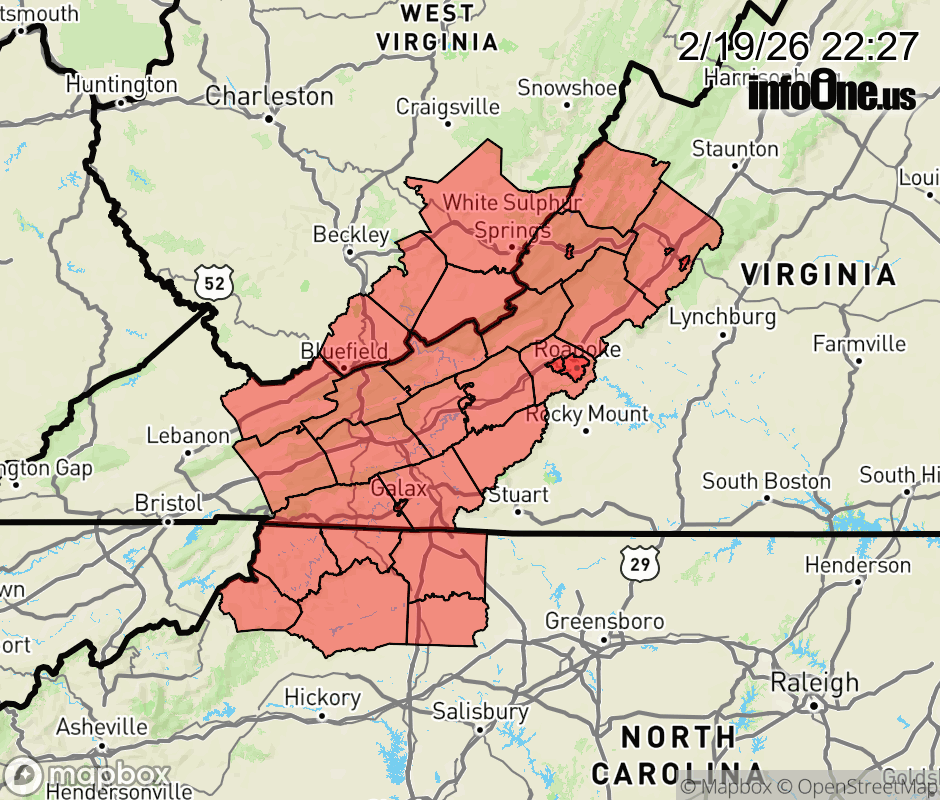 Canceled 2/20/26 8:00 AM Special Weather Statement issued February 19 at 10:25PM EST by NWS Blacksburg VA Thanks to the rain and wet ground, along with light wind, fog will be more prevalent through tonight and into Friday morning at times. Visibilities will drop at times to under a quarter mile, especially across the higher ridges. Those traveling through early Friday morning will need to be watchful for areas of dense fog. Slow down, use your low beams, and allow more braking distance between you and the vehicle ahead of you. ![]() |