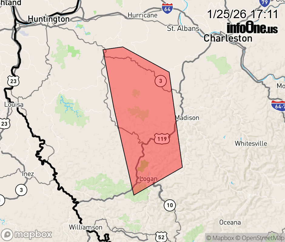 Canceled 1/25/26 6:35 PM Flood Warning issued January 25 at 5:09PM EST until January 25 at 8:00PM EST by NWS Charleston WV * WHAT... Flooding is occurring due to snow melt and runoff. * WHERE... A portion of southern West Virginia, including the following counties, Boone, Lincoln and Logan. * WHEN... Until 800 PM EST. * IMPACTS... Flooding of rivers, creeks, streams, and other low-lying and flood-prone locations is imminent or occurring. * ADDITIONAL DETAILS... - At 456 PM EST, Trained spotter sent pictures of flooding on Garrett's Fork in Chapmanville, Logan County, West Virginia. Garrett's Fork has left its banks and has covered portions of the road. Also receiving reports of scattered localized flooding in Lincoln County. - Some locations that will experience flooding include... Logan, Hamlin, Chapmanville, Spurlockville, Gill, Harts, Chief Logan State Park, Mount Gay-Shamrock, Holden, West Hamlin, West Logan, Mitchell Heights, Mud, Palermo, Alkol, Turtle Creek, Woodville, Yawkey, Griffithsville and Myra. - http://www.weather.gov/safety/flood ![]() |