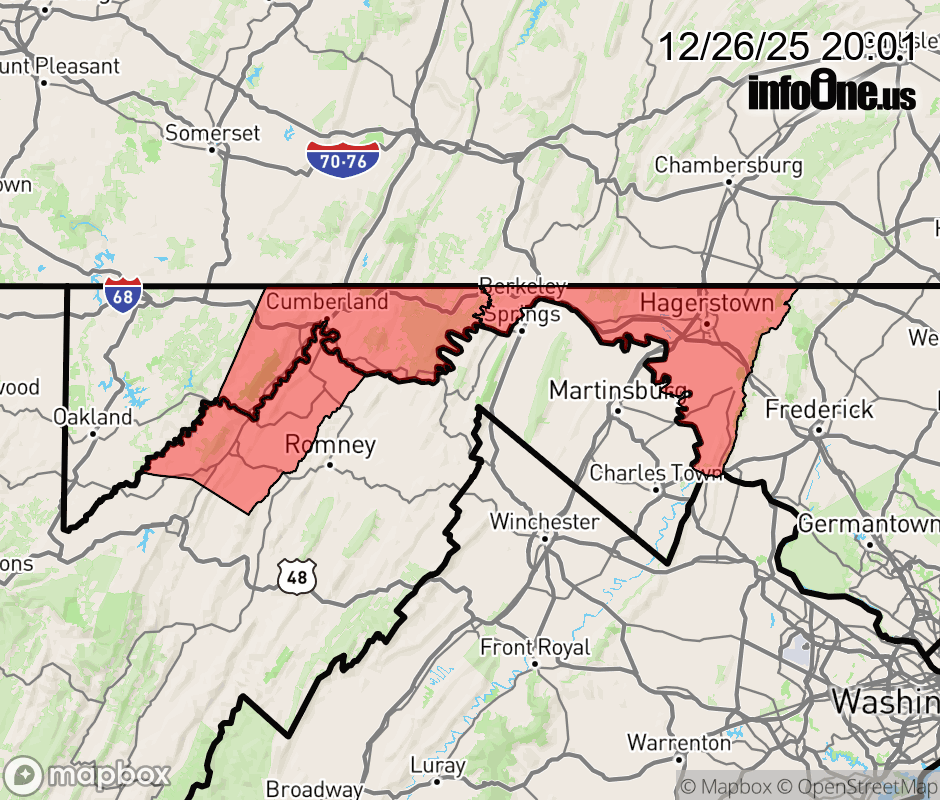 Canceled 12/26/25 11:00 PM Winter Weather Advisory issued December 26 at 8:00PM EST until December 26 at 11:00PM EST by NWS Baltimore MD/Washington DC * WHAT... Freezing rain. Additional ice accumulations around a light glaze. * WHERE... In Maryland, Washington and Central and Eastern Allegany Counties. In West Virginia, Eastern Mineral and Western Mineral Counties. * WHEN... Until 11 PM EST this evening. * IMPACTS... Very slippery sidewalks, roads and bridges are possible. ![]() |