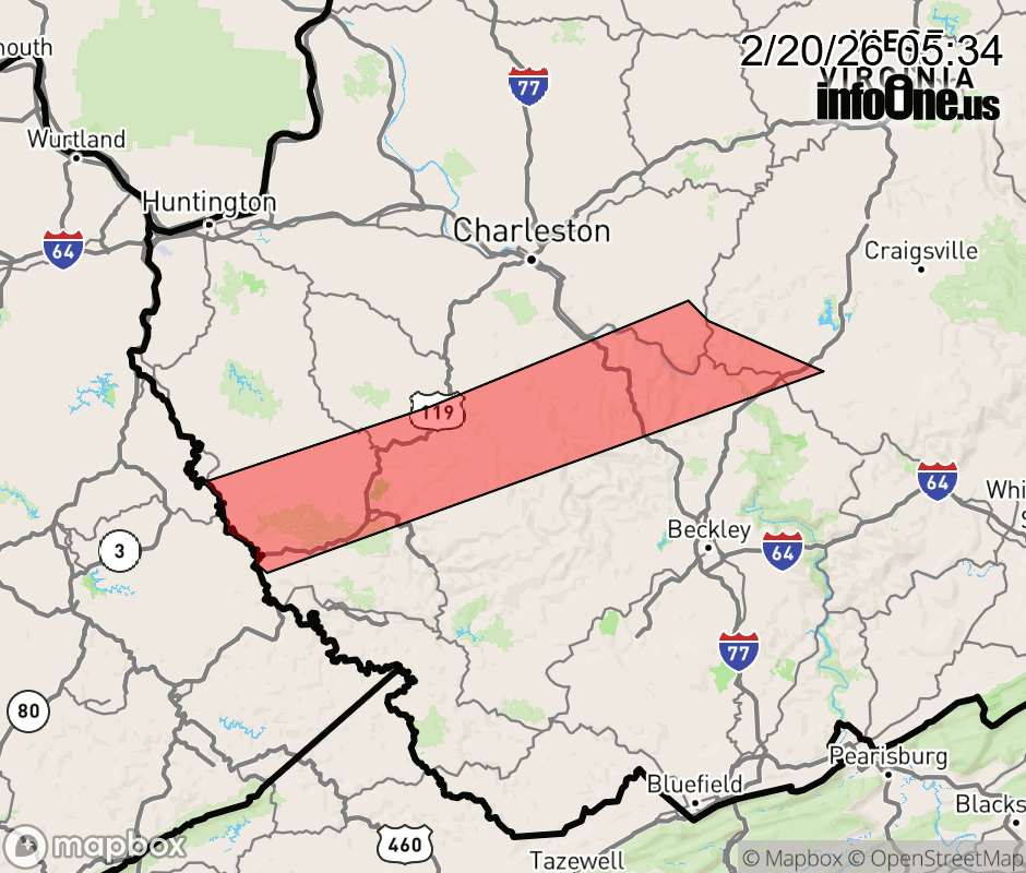 Canceled 2/20/26 8:30 AM Flash Flood Warning issued February 20 at 5:32AM EST until February 20 at 8:30AM EST by NWS Charleston WV FFWRLX The National Weather Service in Charleston has issued a * Flash Flood Warning for... Central Boone County in central West Virginia... Southeastern Kanawha County in central West Virginia... Southwestern Lincoln County in central West Virginia... Northwestern Fayette County in southeastern West Virginia... Northwestern Raleigh County in southeastern West Virginia... Northwestern Logan County in southern West Virginia... Northwestern Mingo County in southern West Virginia... South Central Wayne County in western West Virginia... * Until 830 AM EST. * At 532 AM EST, Doppler radar indicated thunderstorms producing heavy rain across the warned area. Between 1.5 and 2 inches of rain have fallen. Flash flooding is ongoing or expected to begin shortly. HAZARD...Flash flooding caused by thunderstorms. SOURCE...Radar. IMPACT...Flash flooding of small creeks and streams, urban areas, highways, streets and underpasses as well as other poor drainage and low-lying areas. * Some locations that will experience flash flooding include... Madison, Logan, Montgomery, Ansted, Chapmanville, Glasgow, Smithers, Gauley Bridge, Pratt, Van, Chief Logan State Park, Burnwell, Mount Gay-Shamrock, Holden, Powellton, Harts, Hawks Nest State Park, Danville, Whitesville and West Logan. ![]() |