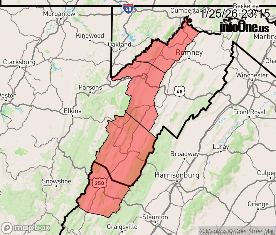 Canceled 1/26/26 7:30 AM Extreme Cold Warning issued January 25 at 11:13PM EST until January 27 at 11:00AM EST by NWS Baltimore MD/Washington DC * WHAT... Dangerously cold wind chills as low as 25 below zero expected, locally nearing 35 below zero in western Pendleton County. * WHERE... In Maryland, Eastern Garrett and Western Garrett Counties. In Virginia, Eastern Highland and Western Highland Counties. In West Virginia, Eastern Pendleton, Western Grant, Western Mineral, and Western Pendleton Counties. * WHEN... From 7 PM Monday to 11 AM EST Tuesday. * IMPACTS... The dangerously cold wind chills as low as 25 below zero could cause frostbite on exposed skin in as little as 30 minutes. Frostbite and hypothermia will occur if unprotected skin is exposed to these temperatures. An extended period of freezing temperatures could cause ruptured water pipes. * ADDITIONAL DETAILS... Additional Cold Weather Headlines are expected at times through the end of the week as the region remains in an Arctic Airmass. ![]() |