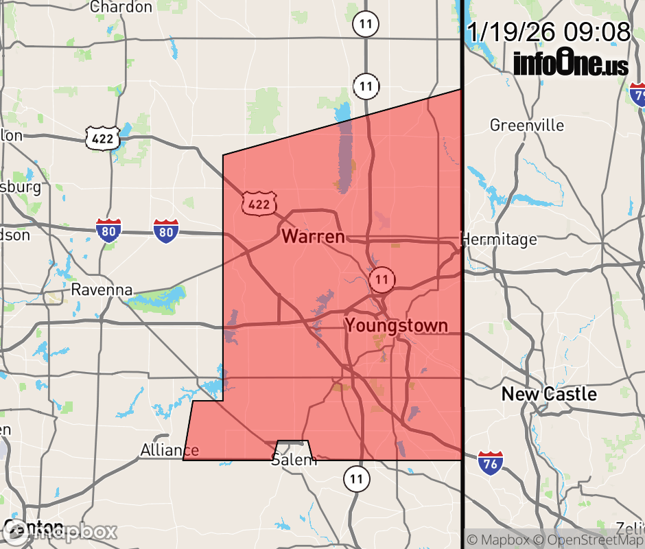 Canceled 1/19/26 10:00 AM Special Weather Statement issued January 19 at 9:07AM EST by NWS Cleveland OH At 905 AM EST, radar indicated snow showers along a line extending from near Leavittsburg to near Hartville, moving east at 45 mph. HAZARDS INCLUDE... Winds to 30 mph... Visibility dropping to less than one half mile... Up to 1 inch of quick snow accumulation... Motorists traveling on Interstate 80 and 76 should slow down and use caution. Locations impacted include... Youngstown, Warren, Salem, Columbiana, Boardman, Niles, Campbell, Hubbard, Canfield, Cortland, Newton Falls, Sebring, Lordstown, Vienna Center, Hilltop, Maplewood Park, Bristolville, Leavittsburg, Austintown, and Struthers. Use extra caution if you must travel. Rapid changes in visibility and potentially slick roads may lead to accidents. ![]() |