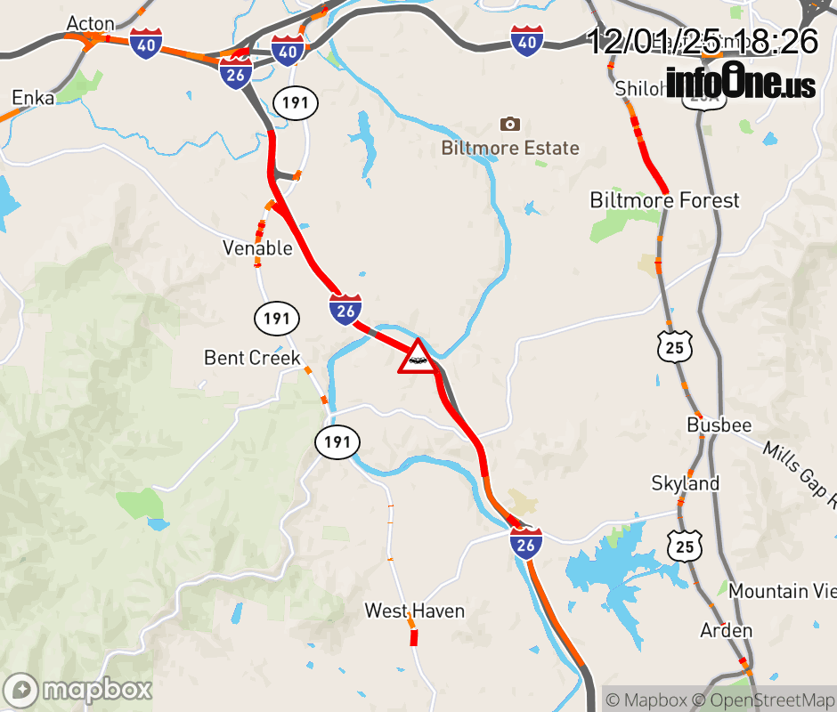The right shoulder is closed 2 miles after Exit 33, NC 191 (Brevard Rd). Updated: Mon 12/1/25 6:26 PM EST ![]() Updated: Mon 12/1/25 6:26 PM EST |