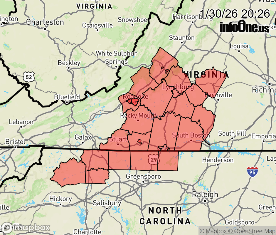Canceled 1/31/26 2:13 AM Extreme Cold Watch issued January 30 at 8:24PM EST until February 1 at 10:00AM EST by NWS Blacksburg VA * WHAT... Dangerously cold wind chills as low as 8 below possible. * WHERE... Portions of north central and northwest North Carolina and central, south central, southwest, and west central Virginia. * WHEN... From Saturday evening through Sunday morning. * IMPACTS... The cold wind chills as low as 10 below zero could result in hypothermia if precautions are not taken. Frostbite and hypothermia will occur if unprotected skin is exposed to these temperatures. ![]() |
