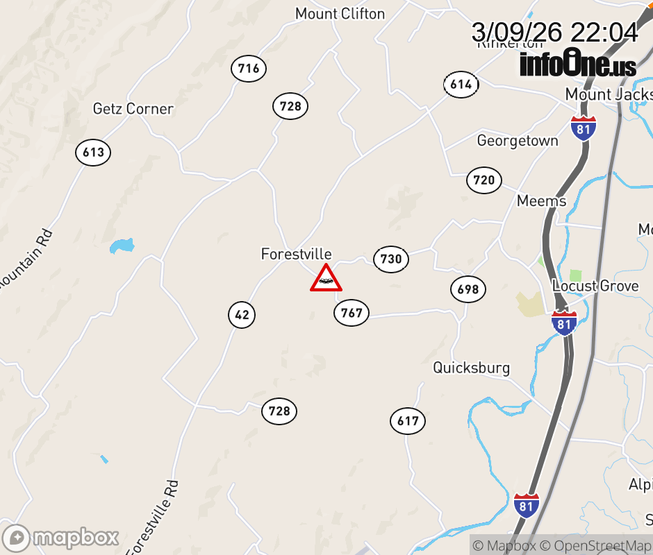 On Rt. 767 in the County of Shenandoah, in the vicinity of Pinewoods Rd; Rt. 730E/W (Shenandoah County), motorists can expect delays due to a vehicle crash. All east lanes are closed. All west lanes are closed. Updated: Mon 3/9/26 10:04 PM EDT ![]() Updated: Mon 3/9/26 10:04 PM EDT |