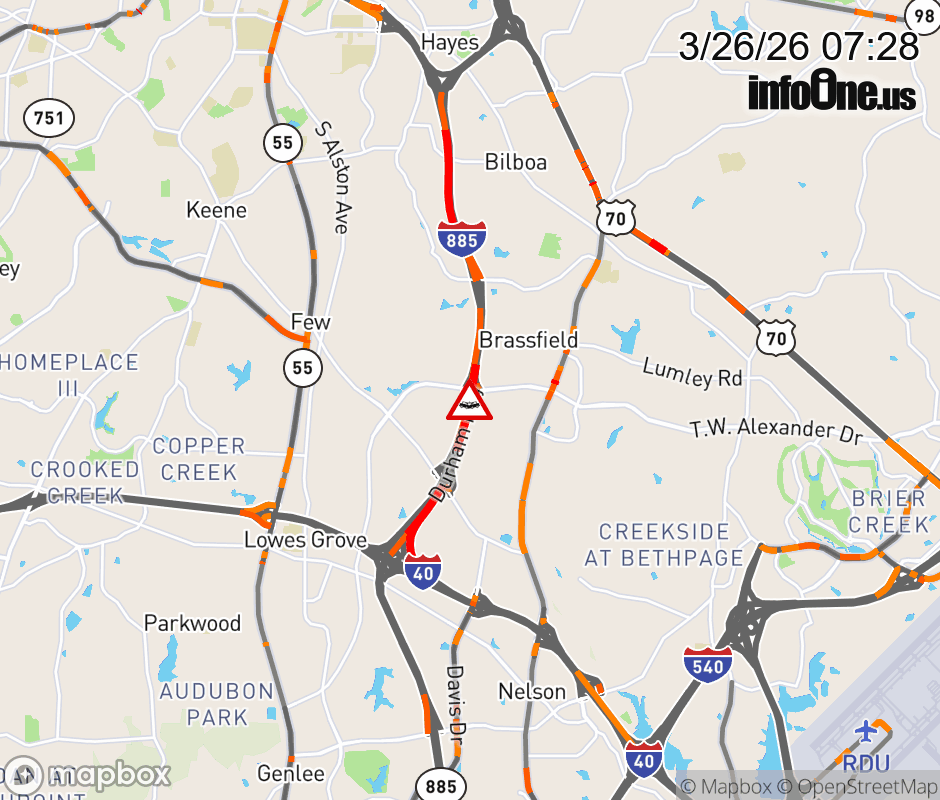 The right shoulder is closed at Exit 7 (TW Alexander Dr). Updated: Thu 3/26/26 7:28 AM EDT ![]() Updated: Thu 3/26/26 7:28 AM EDT |