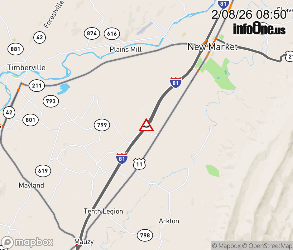 On I-81 at mile marker 262 in the County of Rockingham, motorists can expect delays due to a tractor trailer crash. The south right lane and right shoulder are closed. Updated: Sun 2/8/26 8:50 AM EST ![]() Updated: Sun 2/8/26 8:50 AM EST |