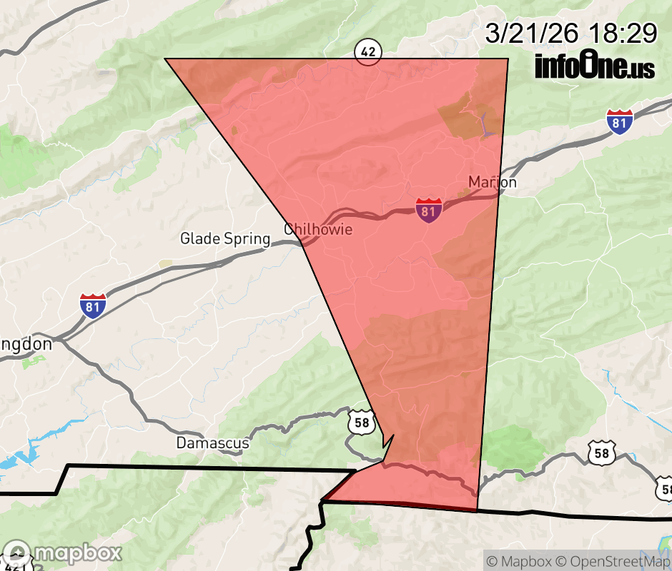 Canceled 3/21/26 7:00 PM Special Weather Statement issued March 21 at 6:28PM EDT by NWS Blacksburg VA At 624 PM EDT, Doppler radar was tracking a strong thunderstorm over central Washington County, moving east at 30 mph. It will enter western portions of Smyth and Grayson Counties by around 7 PM. HAZARD...Wind gusts of 50 to 55 mph. SOURCE...Radar indicated. IMPACT...Gusty winds could knock down tree limbs and blow around unsecured objects. Locations impacted include... Marion...Saltville...THROUGH Chilhowie...Whitetop...Adwolf... Hungry Mother State Park...and Broadford. ![]() |