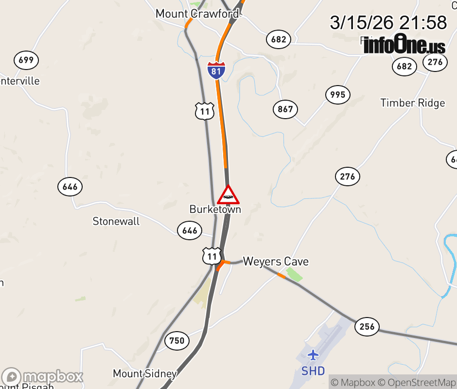 On I-81 North at mile marker 236.5 in the County of Augusta, motorists can expect delays due to a vehicle crash. Updated: Sun 3/15/26 9:58 PM EDT ![]() Updated: Sun 3/15/26 9:58 PM EDT |