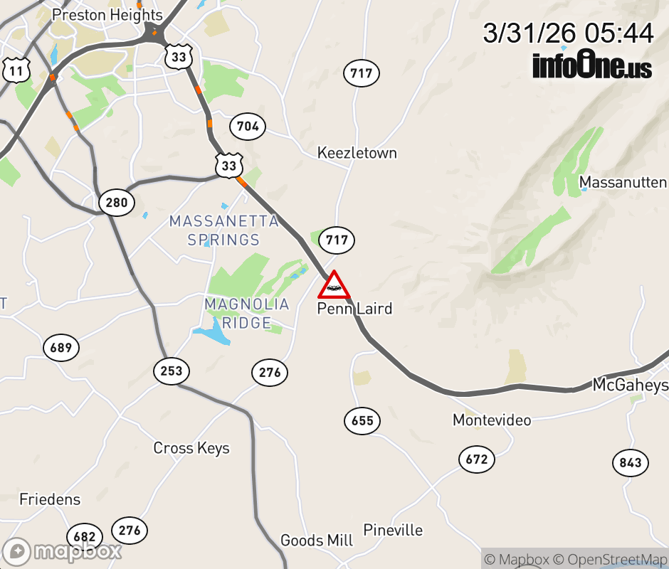 On US-33 in the County of Rockingham, in the vicinity of Indian Trail Rd; Rt. 620N/S (Rockingham County), motorists can expect delays due to a vehicle crash. All west lanes are closed. ![]() |