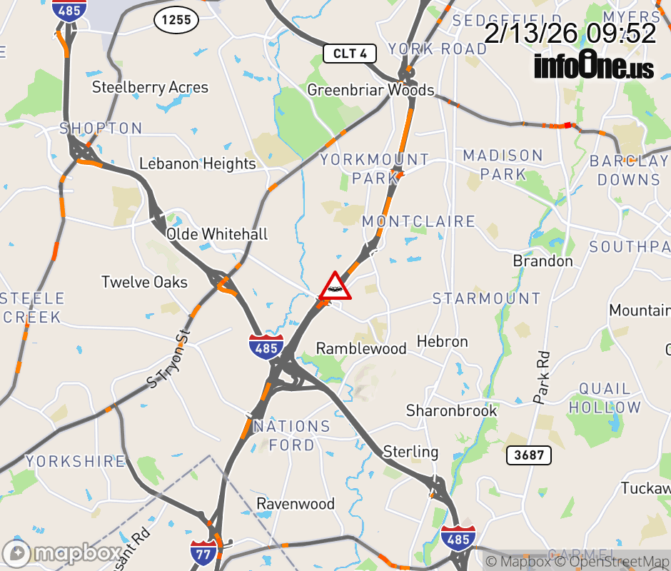 The ramp lane to Arrowood Rd is closed from I-77. Updated: Fri 2/13/26 9:52 AM EST ![]() Updated: Fri 2/13/26 9:52 AM EST |