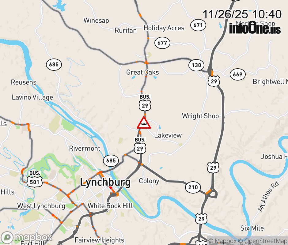 On BUS US-29 North in the County of Amherst, in the vicinity of Mays St; S Amherst Hwy; Seminole Dr; Rt. 681E/W (Amherst County), motorists can expect delays due to a vehicle crash. Lane closures exist. ![]() |