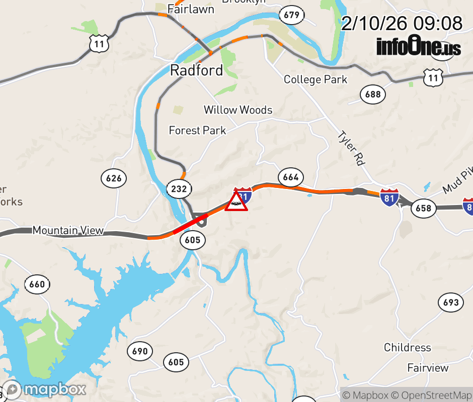 On I-81 at mile marker 106.1 in the County of Montgomery, motorists can expect delays due to a tractor trailer crash. The north right lane and right shoulder are closed. Updated: Tue 2/10/26 9:08 AM EST ![]() Updated: Tue 2/10/26 9:08 AM EST |