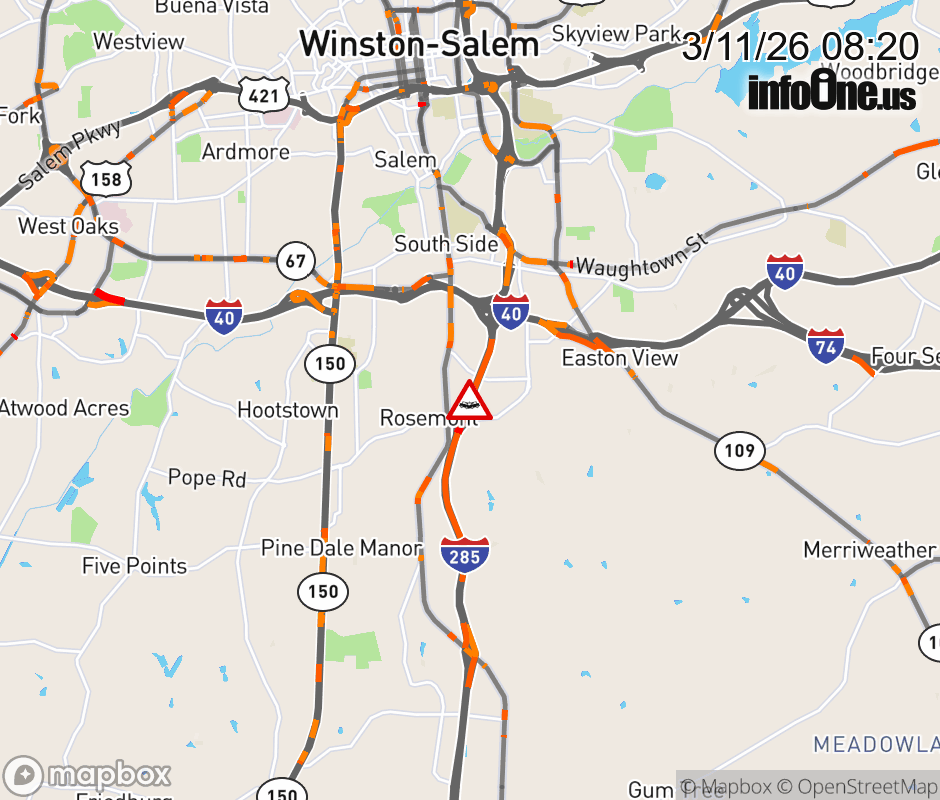 The right shoulder is narrowed at Exit 105 (Clemmonsville Rd). Updated: Wed 3/11/26 8:20 AM EDT ![]() Updated: Wed 3/11/26 8:20 AM EDT |