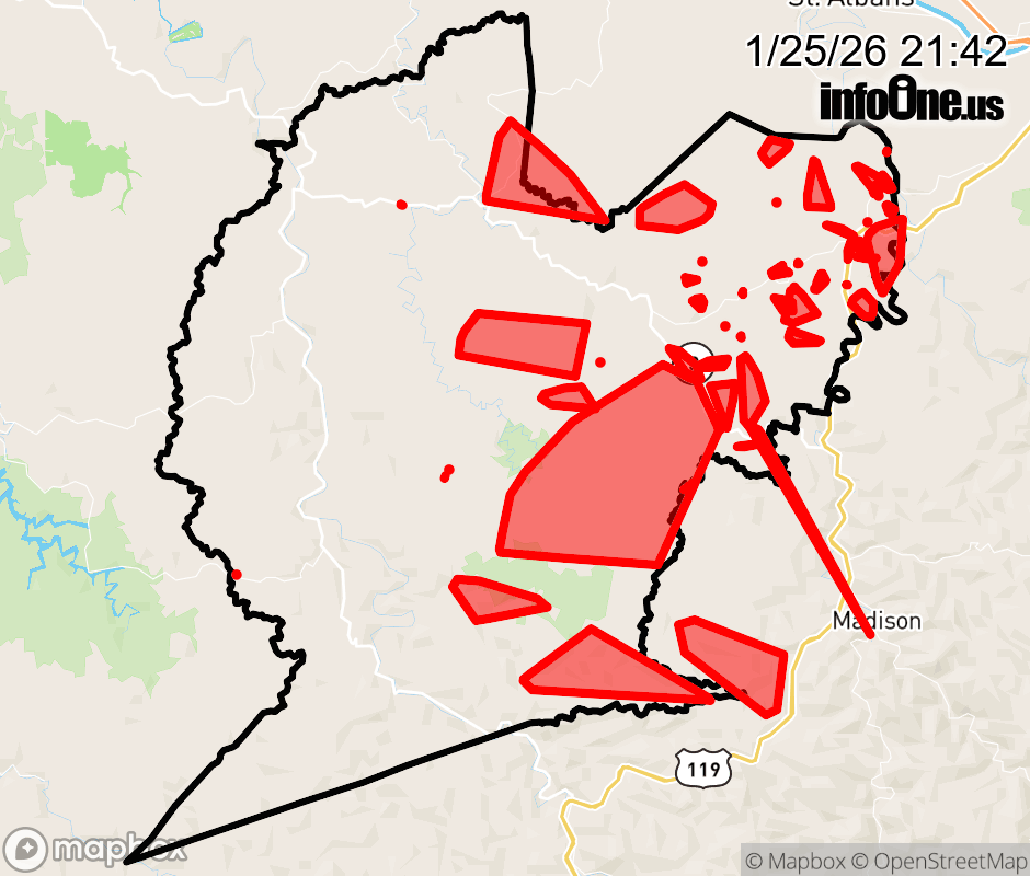 Lincoln County has 55 power outages affecting 1753 customers. Appalachian Power 1753 without power Alkol: Customers affected: 510 (86%) Estimated repair: Mon 11:00 PM Spurlockville: Customers affected: 178 (52%) Estimated repair: Mon 9:00 PM Harts: Customers affected: 164 (10%) Estimated repair: Mon 9:00 PM Griffithsville: Customers affected: 151 (28%) Estimated repair: Mon 11:00 PM Hamlin: Customers affected: 141 (10%) Estimated repair: Mon 10:00 PM Sumerco: Customers affected: 126 (26%) Estimated repair: Mon 11:00 PM Sod: Customers affected: 115 (18%) Estimated repair: Mon 11:00 PM Branchland: Customers affected: 89 (3%) Estimated repair: Mon 11:00 PM Yawkey: Customers affected: 59 (14%) Estimated repair: Mon 11:00 PM Ranger: Customers affected: 19 (3%) Estimated repair: Mon 11:00 PM West Hamlin: Customers affected: 5 (< 1%) Estimated repair: Mon 11:00 PM Updated: Sun 1/25/26 9:42 PM EST ![]() Updated: Sun 1/25/26 9:42 PM EST |
