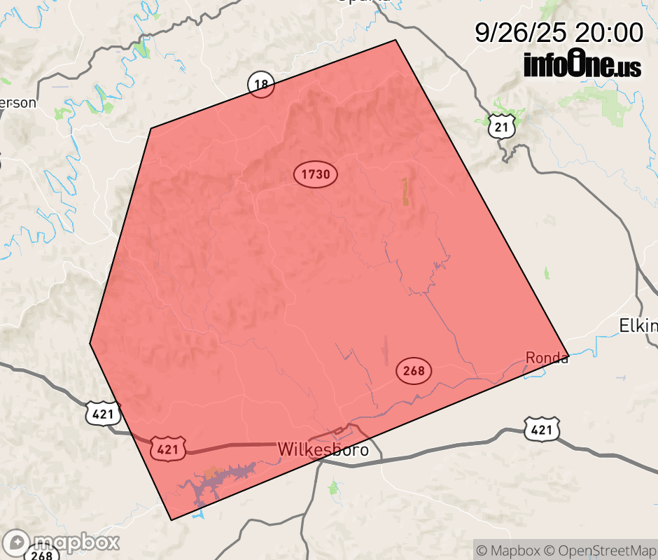 Canceled 9/26/25 10:20 PM Flash Flood Warning issued September 26 at 7:59PM EDT until September 27 at 2:00AM EDT by NWS Blacksburg VA FFWRNK The National Weather Service in Blacksburg has issued a * Flash Flood Warning for... Southwestern Alleghany NC County in northwestern North Carolina... Southeastern Ashe County in northwestern North Carolina... Central Wilkes County in northwestern North Carolina... * Until 200 AM EDT Saturday. * At 759 PM EDT, Doppler radar indicated thunderstorms producing heavy rain across the warned area. Between 2 and 3 inches of rain have fallen. Additional rainfall amounts up to 1 inch are possible in the warned area. Flash flooding is ongoing or expected to begin shortly. HAZARD...Flash flooding caused by thunderstorms. SOURCE...Radar. IMPACT...Flash flooding of small creeks and streams, urban areas, highways, streets and underpasses as well as other poor drainage and low-lying areas. * Some locations that will experience flash flooding include... North Wilkesboro... Wilkesboro... Ronda... Mc Grady... Wilbar... Traphill... Laurel Springs... This includes the following streams and drainages... Darnell Creek, Big Bugaboo Creek, Clear Branch, Bee Tree Branch, East Prong Roaring River, Camp Branch, Big Sandy Creek, Basin Creek, Cane Creek, Cub Creek, Church Branch and Cove Creek. ![]() |