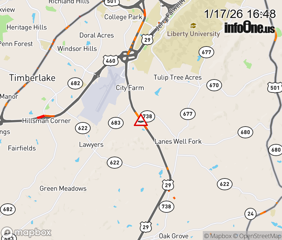 On US-29 in the County of Campbell, in the vicinity of English Tavern Rd; Rt. 738N/S (Campbell County), motorists can expect delays due to a multi-vehicle crash. The north right lane and right shoulder are closed. Updated: Sat 1/17/26 4:48 PM EST ![]() Updated: Sat 1/17/26 4:48 PM EST |
