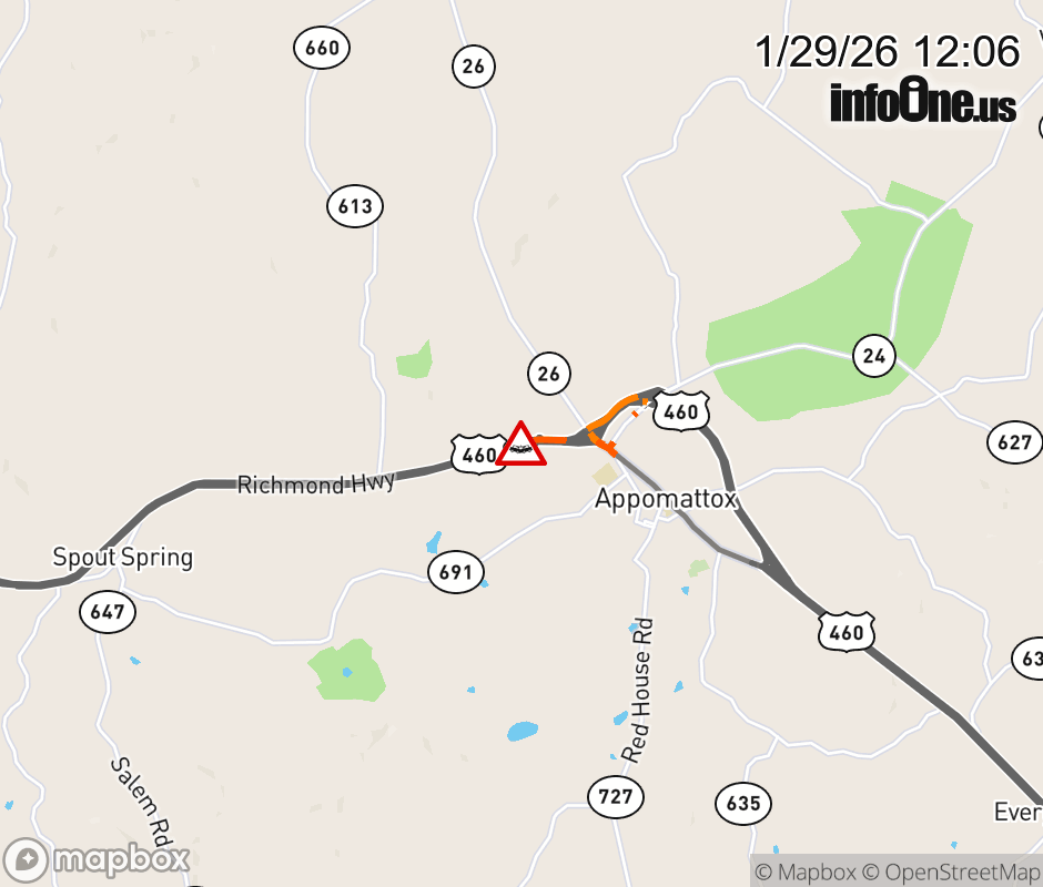 On US-460 in the County of Appomattox, in the vicinity of Ramp Intersection, motorists can expect delays due to a tractor trailer crash. The west left shoulder, left lane, and right lane are closed. Updated: Thu 1/29/26 12:06 PM EST ![]() Updated: Thu 1/29/26 12:06 PM EST |