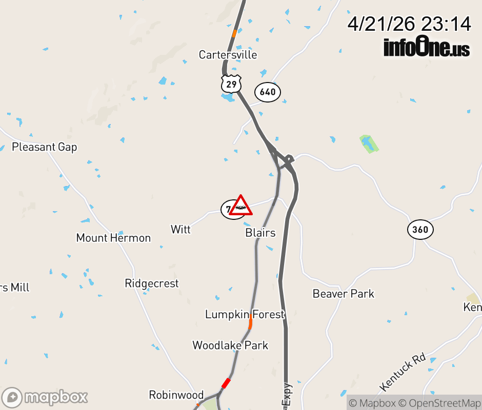 On Rt. 719 North in the County of Pittsylvania, in the vicinity of Rt. 9314E/W (Pittsylvania County), motorists can expect delays due to a vehicle crash. Lane closures exist. Updated: Tue 4/21/26 11:14 PM EDT ![]() Updated: Tue 4/21/26 11:14 PM EDT |