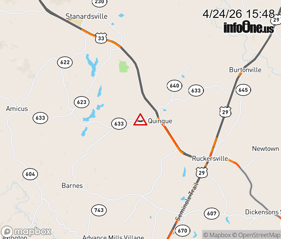 On Rt. 633 in the County of Greene, in the vicinity of Dunnes Shop Rd; Rt. 617N/S (Greene County), motorists can expect delays due to a vehicle crash. All east lanes are closed. All west lanes are closed. Updated: Fri 4/24/26 3:48 PM EDT ![]() Updated: Fri 4/24/26 3:48 PM EDT |