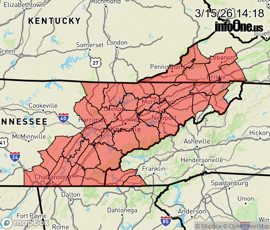 Canceled 3/16/26 1:26 AM Wind Advisory issued March 15 at 2:17PM EDT until March 16 at 8:00AM EDT by NWS Morristown TN * WHAT... South winds 10 to 25 mph with gusts up to 40 mph expected. * WHERE... Portions of southwest North Carolina, east Tennessee, and southwest Virginia. * WHEN... From midnight EDT /11 PM CDT/ tonight to 8 AM EDT /7 AM CDT/ Monday. * IMPACTS... Gusty winds will blow around unsecured objects. Tree limbs could be blown down and a few power outages may result. * ADDITIONAL DETAILS... Wind gusts could be locally stronger along the cold front Monday morning. The wind direction will become westerly near 8 AM EDT ![]() |