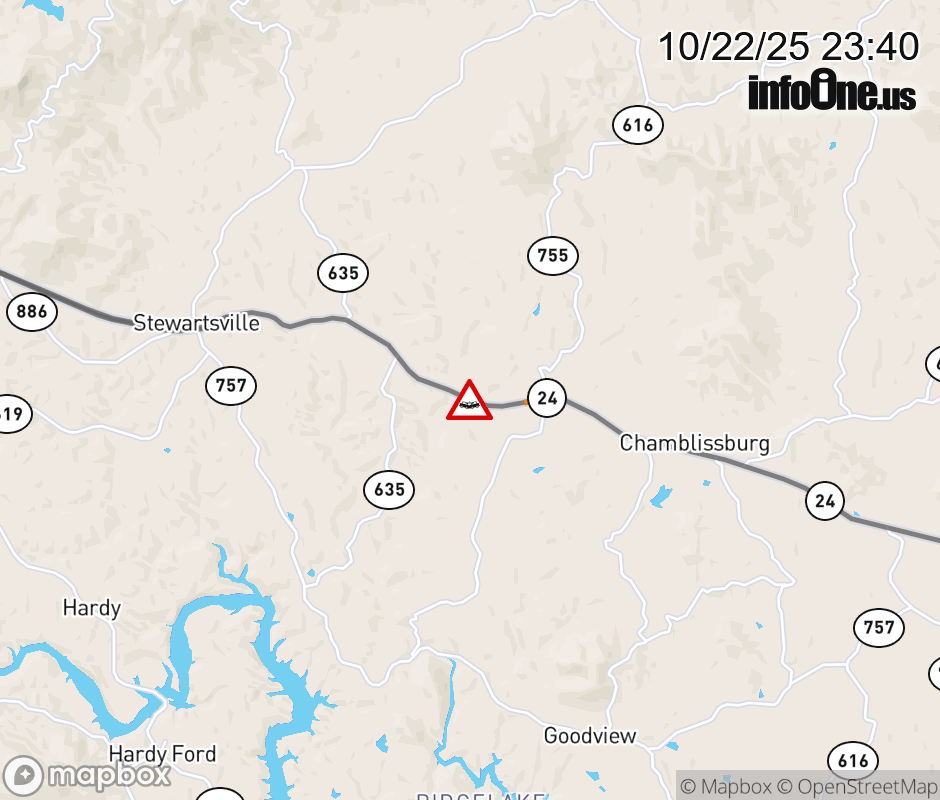 On VA-24 in the County of Bedford, in the vicinity of Hidden Forest Dr; Marigold Dr; Morgans Mill Rd; Spradlin Rd; Rt. 755E/W (Bedford County); / MORGANS MILL RD, motorists can expect delays due to a vehicle crash. All east lanes are closed. ![]() |