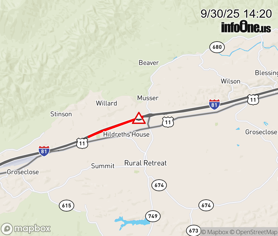 On I-81 North at mile marker 60.2 in the County of Wythe, motorists can expect delays due to a vehicle crash. Traffic backups are approximately 1.0 mile. Updated: Tue 9/30/25 2:20 PM EDT ![]() Updated: Tue 9/30/25 2:20 PM EDT |