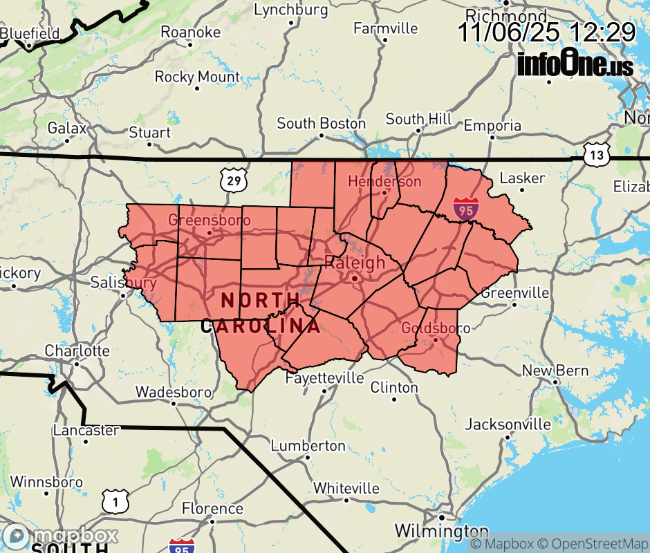 Frost Advisory issued November 6 at 12:28PM EST until November 7 at 8:00AM EST by NWS Raleigh NC * WHAT... Temperatures as low as 33 will result in frost formation. * WHERE... The northern Piedmont, northern Sandhills, and northern and central Coastal Plain of central North Carolina. * WHEN... From 1 AM to 8 AM EST Friday. * IMPACTS... Frost could harm or kill sensitive outdoor vegetation or plants if left uncovered. ![]() |