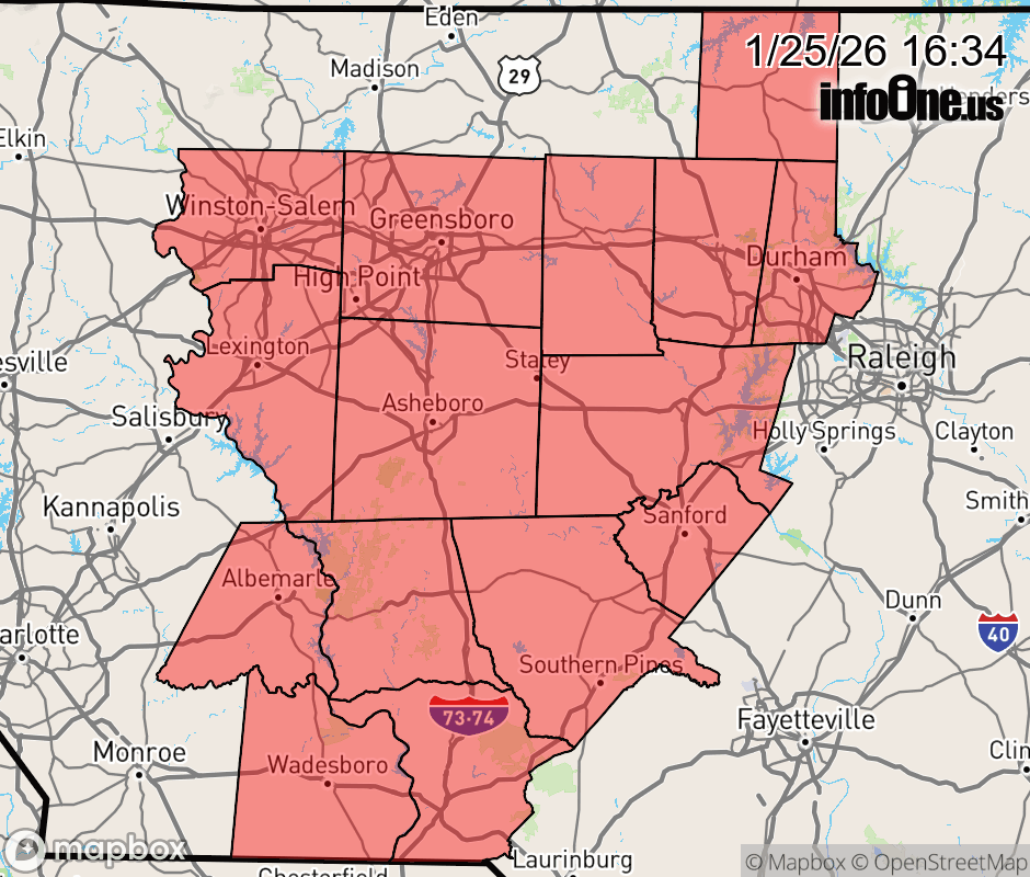 Canceled 1/25/26 10:00 PM Special Weather Statement issued January 25 at 4:32PM EST by NWS Raleigh NC A band of freezing rain will move across the Triad, southern Piedmont, and western Piedmont of central North Carolina between now and 9 PM this evening. Some pockets of sleet may additionally mix in at times. Ice accumulation of a tenth to two tenths of an inch of ice may accumulate on roads, bridges, overpasses, and sidewalks, resulting in extremely hazardous road conditions. ![]() |