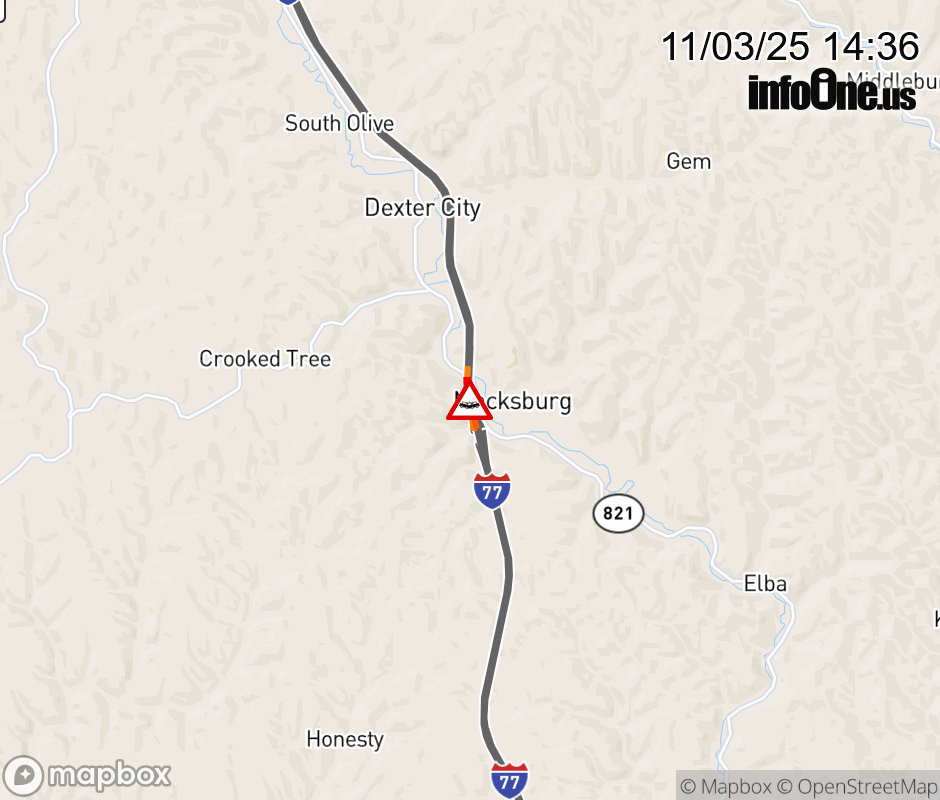 All lanes are closed on I-77 South at SR-821/Macksburg/Dexter City, due to a crash. ![]() |