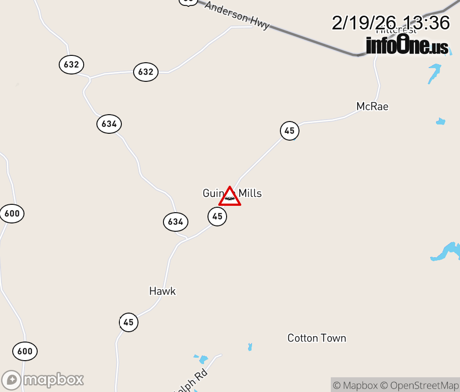 On VA-45 in the County of Cumberland, in the vicinity of Holman Mill Rd; Rt. 640N/S (Cumberland County), motorists can expect delays due to a vehicle crash. All north lanes are closed. ![]() |