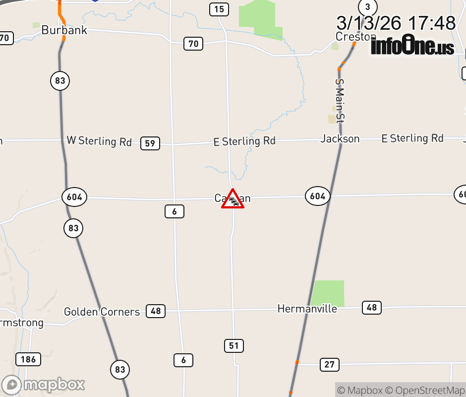 SR-604 CLOSED in BOTH DIRECTIONS at Canaan Center Rd (MM: 10.6), due to trees debris on roadway. Use alternate route. SR-604 CLOSED in BOTH DIRECTIONS at Canaan Center Rd (MM: 10.6), due to trees debris on roadway. Use alternate route. ![]() |