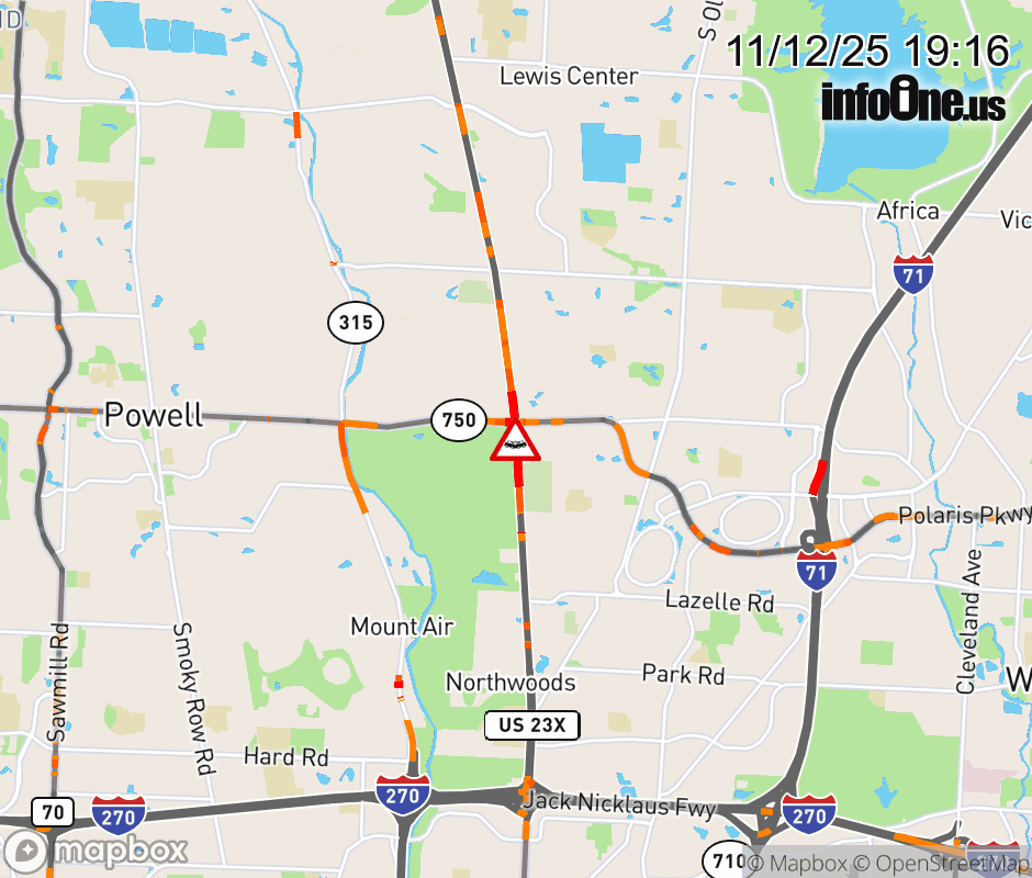 The right lane is closed on US-23 South at E Powell Rd expect lane closures on US-23 North at Green Meadows Dr S, due to a crash. The right lane is closed on US-23 South at E Powell Rd expect lane closures on US-23 North at Green Meadows Dr S, due to a crash. Updated: Wed 11/12/25 7:16 PM EST ![]() Updated: Wed 11/12/25 7:16 PM EST |