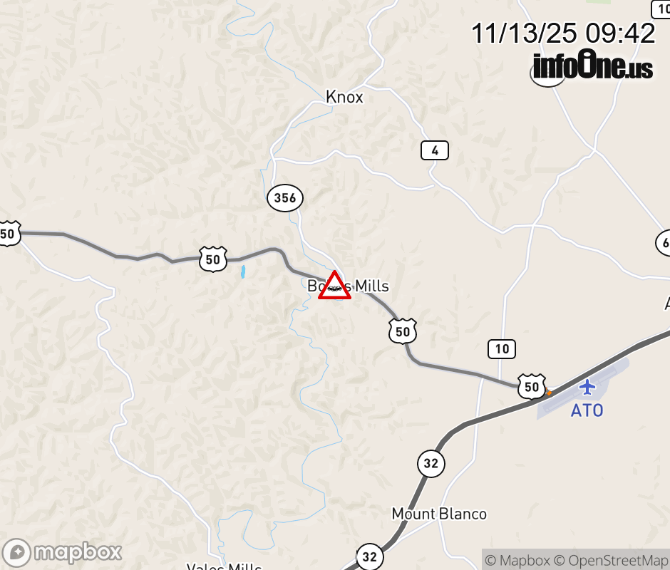 Expect lane closures on US-50 in both directions at SR-356. (MM: 28.5), due to involving a semi-trailer crash. Expect lane closures on US-50 in both directions at SR-356. (MM: 28.5), due to involving a semi-trailer crash. Updated: Thu 11/13/25 9:42 AM EST ![]() Updated: Thu 11/13/25 9:42 AM EST |