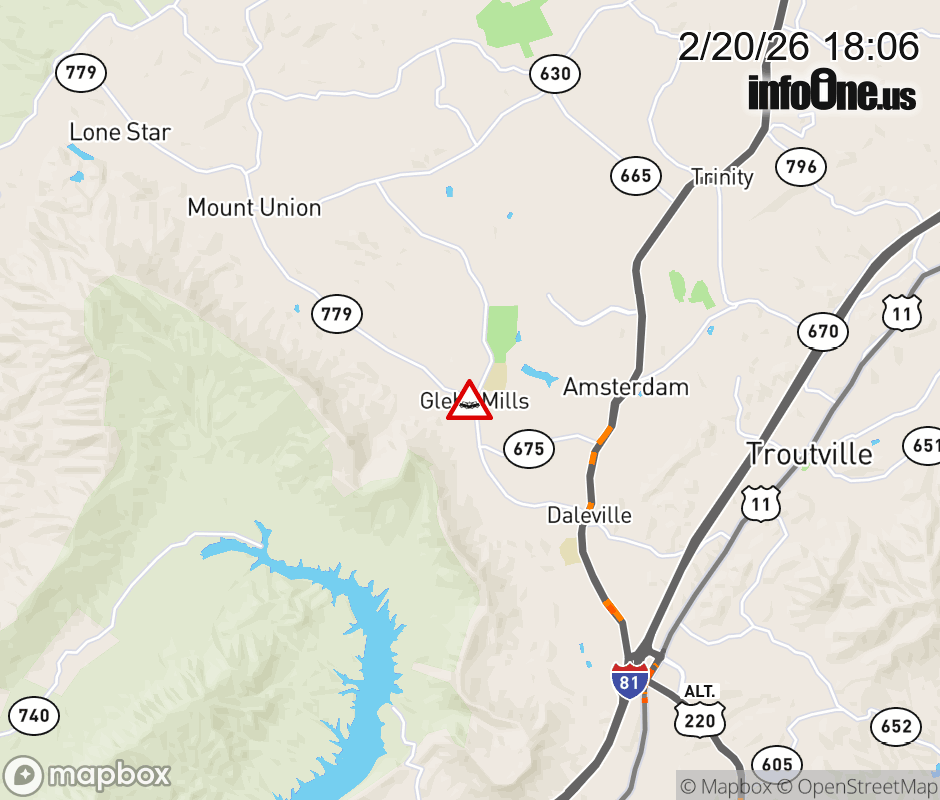On Rt. 779 East in the County of Botetourt, in the vicinity of Etzler Rd; Rt. 672N/S (Botetourt County), motorists can expect delays due to a vehicle crash. Lane closures exist. Updated: Fri 2/20/26 6:06 PM EST ![]() Updated: Fri 2/20/26 6:06 PM EST |