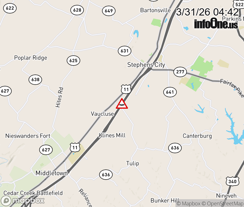 On I-81 at mile marker 305.5 in the County of Frederick, motorists can expect delays due to a tractor trailer crash. The south right shoulder is closed. Updated: Tue 3/31/26 4:42 AM EDT ![]() Updated: Tue 3/31/26 4:42 AM EDT |