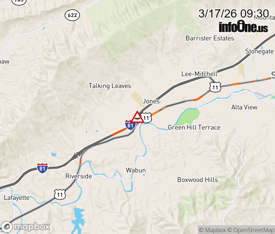 On I-81 at mile marker 134.5 in the County of Roanoke, motorists can expect delays due to a tractor trailer crash. The south right shoulder is closed. Updated: Tue 3/17/26 9:30 AM EDT ![]() Updated: Tue 3/17/26 9:30 AM EDT |