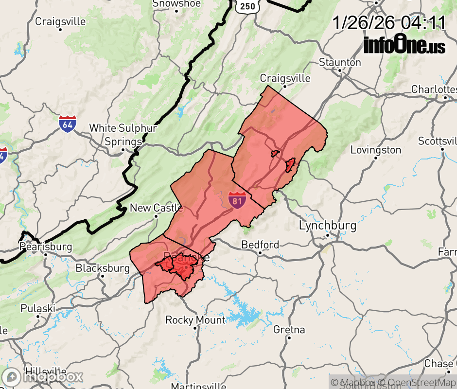 Canceled 1/26/26 1:38 PM Extreme Cold Warning issued January 26 at 4:10AM EST until January 27 at 12:00PM EST by NWS Blacksburg VA * WHAT... Dangerously cold wind chills as low as 10 below zero expected. * WHERE... Botetourt, Roanoke, and Rockbridge Counties. * WHEN... From 6 PM this evening to noon EST Tuesday. * IMPACTS... The cold wind chills as low as 10 below zero could result in hypothermia if precautions are not taken. ![]() |