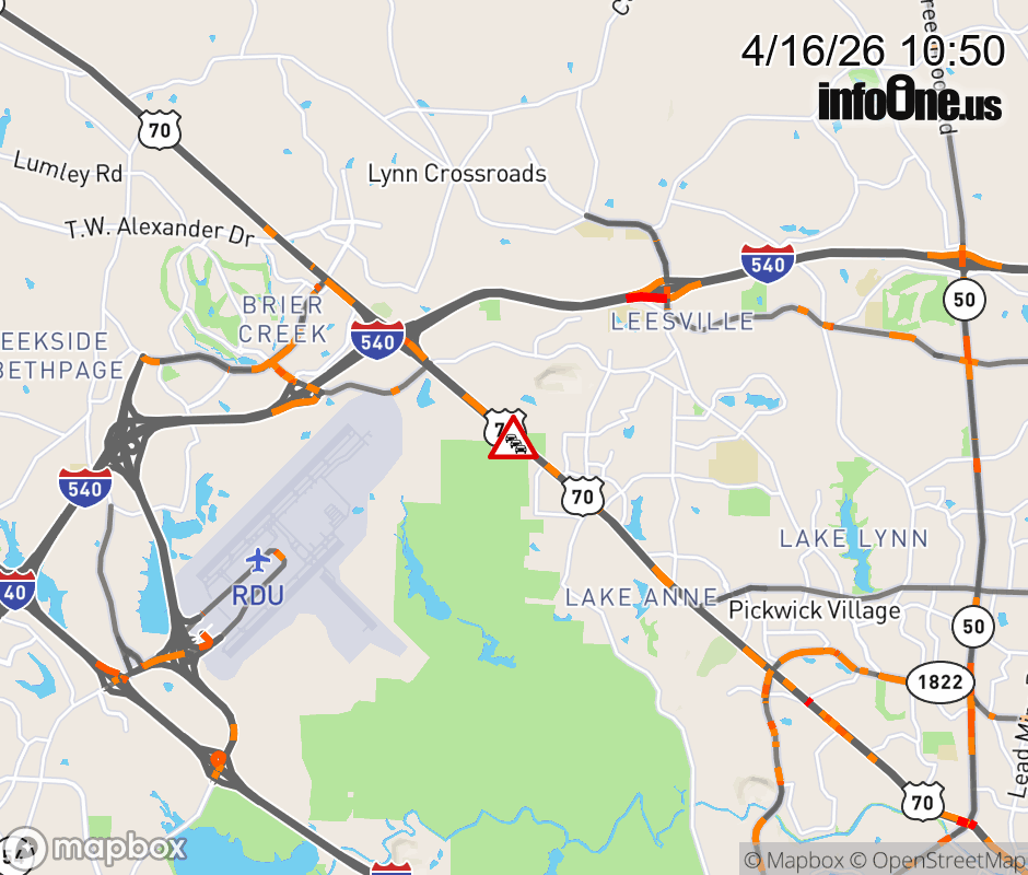 The right lane is closed at Exit 4 (US 70/Glenwood Ave) Updated: Thu 4/16/26 10:50 AM EDT ![]() Updated: Thu 4/16/26 10:50 AM EDT |