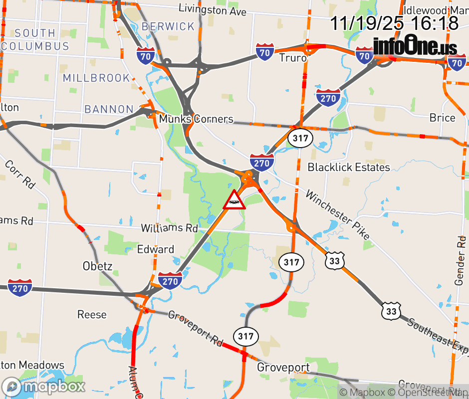 The left lane is blocked on I-270 North at US-33, due to a crash. Updated: Wed 11/19/25 4:18 PM EST ![]() |