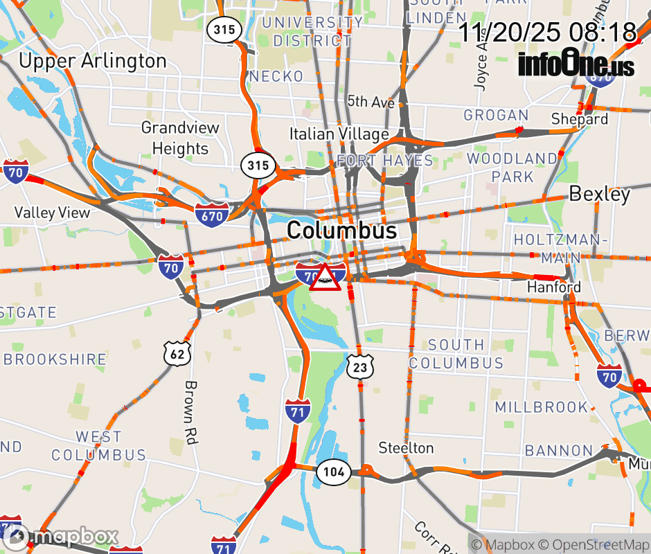 All lanes are blocked on I-70 East/I-71 North at US-23 South/Front St/High St, due to a crash. Updated: Thu 11/20/25 8:18 AM EST ![]() Updated: Thu 11/20/25 8:18 AM EST |
