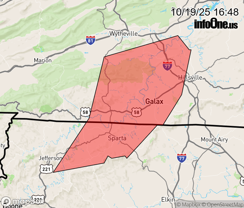Canceled 10/19/25 5:15 PM Special Weather Statement issued October 19 at 4:44PM EDT by NWS Blacksburg VA At 444 PM EDT, Doppler radar was tracking strong thunderstorms along a line extending from Speedwell to near Bridle Creek to Wagoner. Movement was east at 30 mph. HAZARD...Wind gusts up to 50 mph. SOURCE...Radar indicated. IMPACT...Gusty winds could knock down tree limbs and blow around unsecured objects. Locations impacted include... Galax... Sparta... Independence... Fries... Laurel Springs... Ennice... and Patterson. ![]() |
