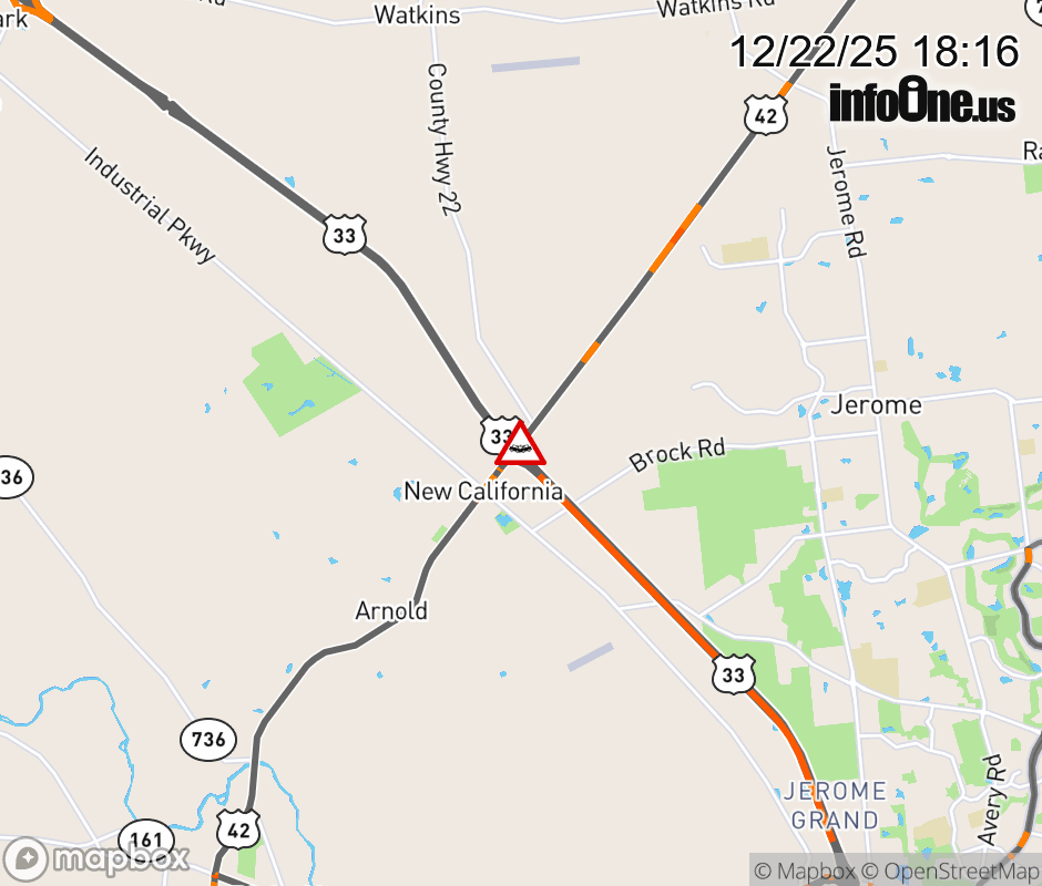 Expect lane closures on US-42 in both directions at Watkins California Rd. (MM: 4.7), due to crash. ![]() |