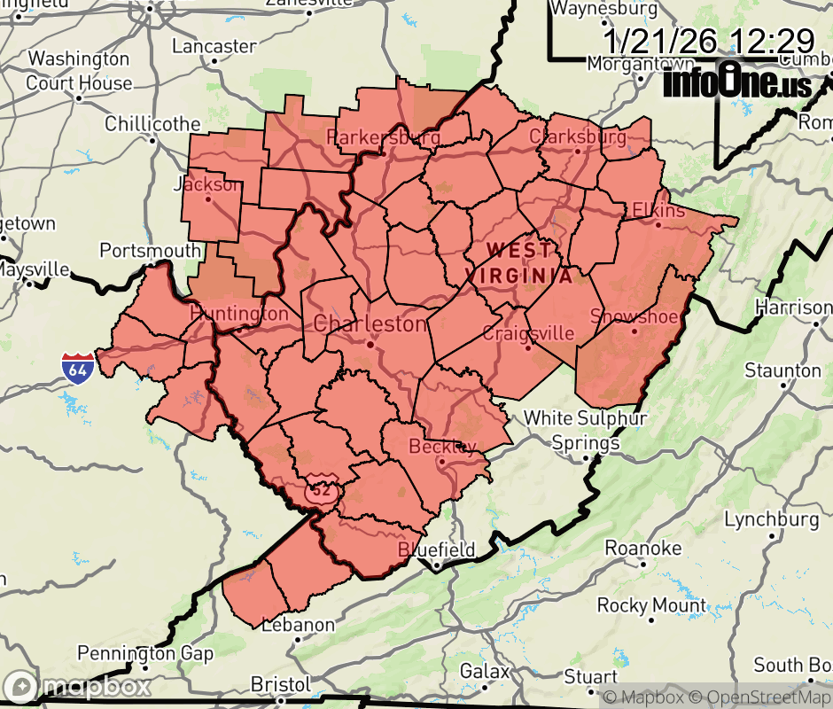 Canceled 1/21/26 8:21 PM Winter Storm Watch issued January 21 at 12:28PM EST until January 26 at 7:00AM EST by NWS Charleston WV * WHAT... Heavy snow expected. Total snow accumulations between 6 and 12 inches possible. Locally higher amounts are possible. * WHERE... Portions of northeast Kentucky, southeast Ohio, southwest Virginia, and central, northeast, northern, southeast, southern, and western West Virginia. * WHEN... From Saturday morning through Monday morning. * IMPACTS... Travel could be very difficult to impossible. The hazardous conditions could impact the Monday morning commute. ![]() |